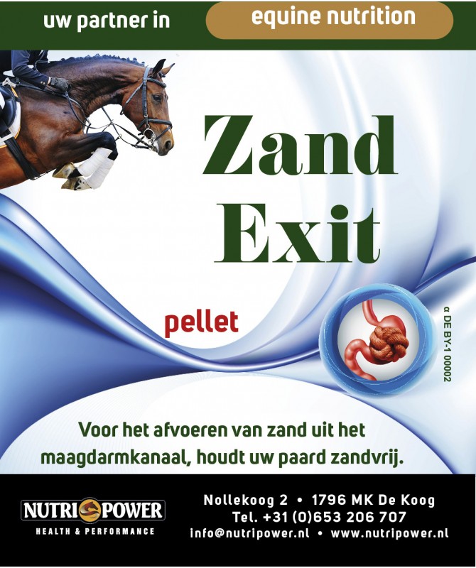 .Zand-Exit van NutriPower® is een hoogwaardig, natuurlijk samengesteld voedingssupplement speciaal ontwikkeld om de eliminatie van zand uit het maag-darmkanaal van paarden en pony’s te ondersteunen Met een zorgvuldig gekozen mix van vezels, gut-friendly ingrediënten en elektrolyten helpt Zand-Exit de spijsvertering te optimaliseren en het risico op zandophoping te verminderen — op een zachte én effectieve manier.